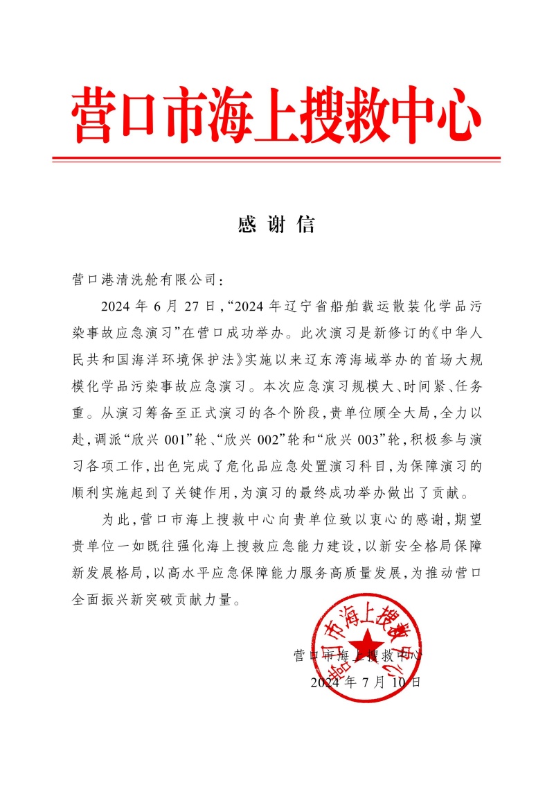 感謝信——營(yíng)口港清洗艙有限公司